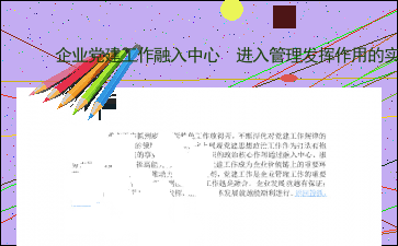 (四)党建工作融入中心、进入管理、发挥作用,创新点在于将党建工作放在发展经济、构建和谐的宏大目标中去研究,放在企业自身改革发展中去思考,放在企业决策部署中去安排,融入融合到企业跨越发展目标中去实践。要在发展中形成新思路,在改革中寻求新突破,在工作中体现新举措,有利于增强党建工作创新实践的责任感和紧迫感,大力探索实践党建工作的新方法新途径,在企业党建与中心工作有机结合、融入过程的同频共振中,把实际工作抓具体,在关键环节促深化,把重点工作抓到底,创新特色工作放得开,不断深化对党建工作规律的探索和把握,在更广的领域和更高的层次上展现党建思想政治工作作为打造有抱负、负责任、受尊重的事业和团队,使党组织的政治核心作用通过融入中心、服务大局、拓宽领域、提高能力落到实处,使党建工作成为企业价值链上的重要环节,***发展的内在推动力量。实践证明,党建工作是企业管理工作的重要组成部分,党建工作越是深入到位,党政工作越是融合,企业发展就越有保证;企业党组织作用越是得到有效发挥,企业的改革发展就越能顺利进行。返回搜狐,查看更多