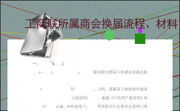 一、商会换届流程1、商会届满前3个月,向市工商联报送商会换届工作请示及相关换届材料;2、换届申请时,商会党组织人员有变动的,需报请上级党组织批准进行选举或任命。未成立党组织的商会,根据《中国共产党章程》和商会党员实际数量,向驻地党工委、中共*_**等部门申请筹建成立商会党组织;3、由市工商联组织部牵头,组织进行考察,商市委统战部对会长、秘书长人选进行综合评价,形成考察材料;4、经市工商联党组会研究决定后,批复商会换届;5、商会召开换届大会;6、换届大会后,商会向市工商联报送换届大会选举结果报告;7、所有资料准备齐后,交市工商联联组织部。市工商联派出考察组对换届工作进行考察,考察后提请党组会研究通过后,商会对新一届负责人候选人向全体会员公示,公示7天后,按照《章程》和民政局有关要求筹备并召开会员大会,依法选举产生新一届领导班子和领导机构。二、商会换届需要提供的资料清单1、召开第X次 内容过长,仅展示头部和尾部部分文字预览,全文请查看图片预览。 事会工作报告和财务工作报告;2、听取关于《章程》修改情况的说明,审议通过《章程》(修订稿);3、向大会报告候选人产生和征求意见情况,通过选举办法;4、介绍候选人情况,选举产生新一届组织机构和负责人;5、其他事项。(二)有关要求1、规范对章程的修订。对章程进行修改、调整的,要依据民政部发布的章程示范本,并应在会员(或会员代表)大会审议前,书面征求主管单位、登记管理机关意见;2、应当在批准期限内完成换届;3、按照“一届一备、变更必备”的原则,换届产生的新一届会长(理事长)、副会长(副理事长)、秘书长后,均应按照相关规定,及时到主管单位、登记管理机关办理负责人变更备案手续;4、新一届负责人的年龄、任期资格条件均应符合相关文件精神和章程规定;5、商会法定代表人须由章程明确的负责人担任,同时不得兼任其他社会团体法定代表人;6、商会不得依未经合法程序制定和备案的标准收取会费,或超标准收取会费。