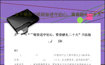 为喜迎党的二十大胜利召开,庆祝中国共产主义青年团成立100周年,引导广大团员青年以实际行动“喜迎二十大、永远跟党走、奋进新征程”,自觉坚定听党话、高举团旗跟党走,贯彻落实习近平新时代中国特色社会主义思想。经研究决定,开展“砥砺奋进守初心、青春献礼二十大”书法绘画大赛,现将有关事宜通知如下: